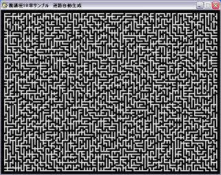 #define MY 59 ; Y方向のマス数 randomize sdim map,2,MX*MY*2 repeat MY repeat MX tmp=row*MX+cnt ; 外枠の場合通過する if row<2|(cnt<2)|(MX-2<=cnt)|(MY-2<=row) { map.tmp="1" ; 1つ飛びで壁を配置し,通路になるマスのうつ3/1を壁とする } else { if row\2=1&(cnt\2=1) { map.tmp="1" } else { rnd r,3 : r=r/2 : map.tmp=""+r } } loop row+ loop title "迷路自動生成" sx=640/MX : sy=480/MY ; 1マスの大きさを計算 redraw 0 repeat MY*MX if map.cnt="1" : boxf cnt\MX*sx,cnt/MX*sy,cnt\MX*sx+sx,cnt/MX*sy+sy loop redraw stop
