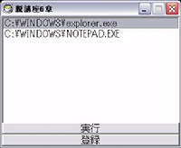 screen 0,300,200 title "ランチャー ver1.00" sdim touroku,32000 sdim execution,128 objsize 300,20 listbox index,160,touroku pos 0,160 : button "登録",entry pos 0,180 : button "実行",running stop *entry dialog "",16 if stat==0 : stop if touroku!="" : touroku+="\n" ; 登録されているアイテムが1以上だと変数に改行を追加しておく touroku+=refstr objprm 0,touroku stop *running if index==-1 : stop ; リストのアイテムがどれも選択されていない時は実行できなくしておく notesel touroku noteget execution,index exist execution if strsize==-1 : dialog ""+execution+"は存在しません" : stop exec execution,16 ; 関連付けられているプログラムで開く