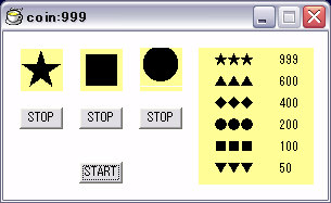 buffer 2,40,440 font "MS ゴシック",40 color 255,255,150 repeat 11 boxf 1,cnt*40+1,39,cnt*40+40-1 loop color pos 0, 0 : mes "★" pos 0, 40 : mes "▲" pos 0, 80 : mes "♪" pos 0,120 : mes "◆" pos 0,160 : mes "●" pos 0,200 : mes "■" pos 0,240 : mes "▼" pos 0,280 : mes "◎" pos 0,320 : mes "×" pos 0,360 : mes "※" pos 0,400 : mes "★" screen 0,160,100 dim roll,3 dim move,3 font "MS ゴシック",12 : objmode 2 objsize 40,20 repeat 3 pos 40*cnt+(cnt+1*10),60 : button "STOP",rollstop loop *main repeat repeat 3 redraw 0 pos 40*cnt+(cnt+1*10),10 : gcoPY 2,0,roll.cnt*10,40,40 redraw if move.cnt=0 : roll.cnt- : if roll.cnt<=0 : roll.cnt=40 ; 動いてるロールは回転する loop wait 1 ; 数値を増やすと遅くなる if move=1 & (move.1=1) & (move.2=1) : break ; すべてのロールが止められたらループを抜ける loop ; 当たり判定をココに入れる goto *main *rollstop move.stat=1 goto *main