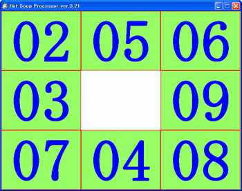 #define SX (ginfo_winx / numx) #define SY (ginfo_winy / numy) numx = 3 numy = 3 randomize gosub *game_start gosub *game_main gosub *game_clear stop |