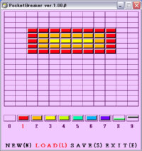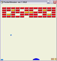 β版ですがバグ取りに時間が掛かり過ぎ、そのままアップしました(vector未登録 上図を見ていただければわかるかと思いますがブロック崩しゲームです。 普通のものと異なる点といえば、打ち返すバーが弧状になっており、 当たる位置によって角度が変わると言う所くらいでしょうか。 この特性を利用すれば自分の打ち返したい方向に打ち返せるようになることでしょう。 ハイスコア(得点,時間,(COMBO))記録をしますので得点で友達とかと競ってください(^^; ステージ作成機能を搭載しているので自分で作成したステージで遊べて、 また、ファイル保存もできる為、ステージ配布も楽チンです(配布はご自由に行って結構です)。 配布ステージに最高得点と最短クリア時間も付加されますので 誰が配布したステージでスコアはどれだけ行ったかが一目でわかります。 尚、作成したステージデータを募集してます(連絡頂ければ誰でもプレイできるよう公開します) 送信方法はメールの内容にステージデータを入れるか、メールに添付してください。 提供者名をいれてココに送信してください。 恐らくかなりの高得点をたたき出すことが出来ると思われるステージデータを公開中。 関連情報ファイルを右クリックし「対象をファイルに保存」を選択して、 PocketBreakerフォルダにDLしてください。 ステージの読み込み方はReadme.txtをご覧ください。 | |