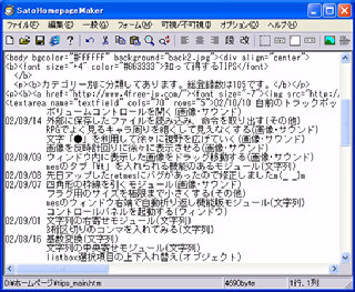 タグを手入力でhtmlページを作成する人の為、 自動タグ入力後のキャレット位置に気を配った…つもりのエディター。 自動保存機能を付け、万が一に備えて指定時間置きにshmが自動でバックアップ。 最新バージョンの主な追加・変更点は下記の通り。 ・バッファサイズを変更可能(ただし9X系は64KBが限界)にした。 ・最小化時でもショートカットキーを取得してしまうバグをはじめ4点修正。 ・Java、VBscript読み込み機能追加。 ・書式に中央寄せ・等幅フォント・上付き,下付き文字を追加 ・設定項目が多いので書式とは別に単体でスクロールを追加 ・フォームにラジオ・チェックボックス追加 ・特殊文字・記号の挿入機能追加 ・ルビ機能の追加