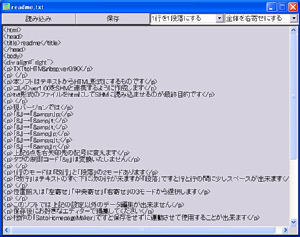 テキスト形式のファイルをHTML形式にするだけという 余計な機能を入れておらず一部では「何気にイイ」と囁かれるシンプルな変換ツール。 テキストの1行を「改行」ですぐ下に折り返すか 「段落」として行間を少し空けるかの設定と、 位置揃え「左」「中央」「右」寄せを行うだけ。 HTML形式で表示できない文字も6点自動で変更してくれるようになっています。 変更されるのは基本的なものばかりで「 」「<」「>」「&」「"」「¥」。 このソフトでは自由に編集が出来ませんがSHMのver1.41以降と連動可能です。