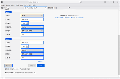 [受信サーバー(IMAP)(I)] には [993] と入力して [このサーバーは暗号化された接続(SSL)が必要(E)] のチェックボックスにチェックしていることを確認して [送信サーバー(SMTP)(O)] には [587] と入力して、 [使用する暗号化接続の種類(C)] には [TLS] を選択して [OK] をクリックします。